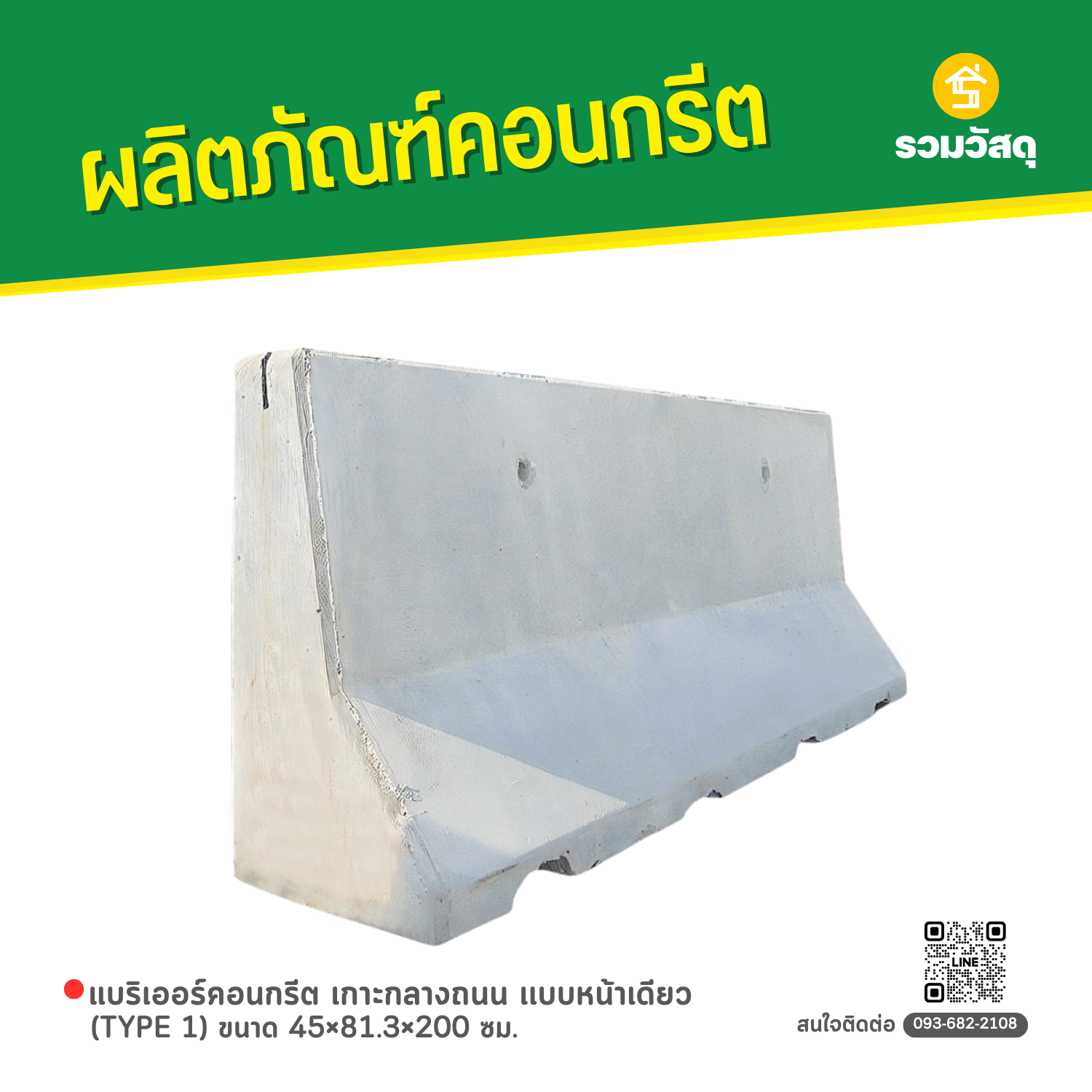 แบริเออร์คอนกรีต เกาะกลางถนน เเบบหน้าเดียว (TYPE 1) ขนาด 45×81.3×200 ซม.